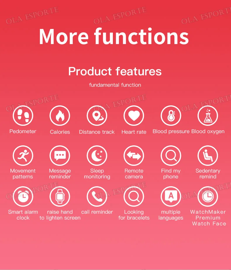 - Fonction: Résistant aux chocs,Passometer,Tracker de fitness,Tracker de sommeil,Tracker d’humeur,Rappel de message,Rappel d’appel,Répondre à l’appel,Composer un numéro,Télécommande,Message push,Altimètre,Tourbillon,Trois grosses aiguilles,Instruction 24 heures,Chronographe,Réveil,Petite seconde,HEURE DU MONDE,Compteur de calories,DIVERT,Calendrier permanent,Fuseau horaire multiple,Autonomie,Prière,GMT Deux endroits,Fenêtre de perspective,week,Phases de la lune,mesure de la vitesse,MOIS,Moniteur de fréquence cardiaque,Musique interactive,Noctilucent,Thermometer,CALENDRIER,Boussole,Éclairage,COMPTE À REBOURS,calculatrices,Oxymètre